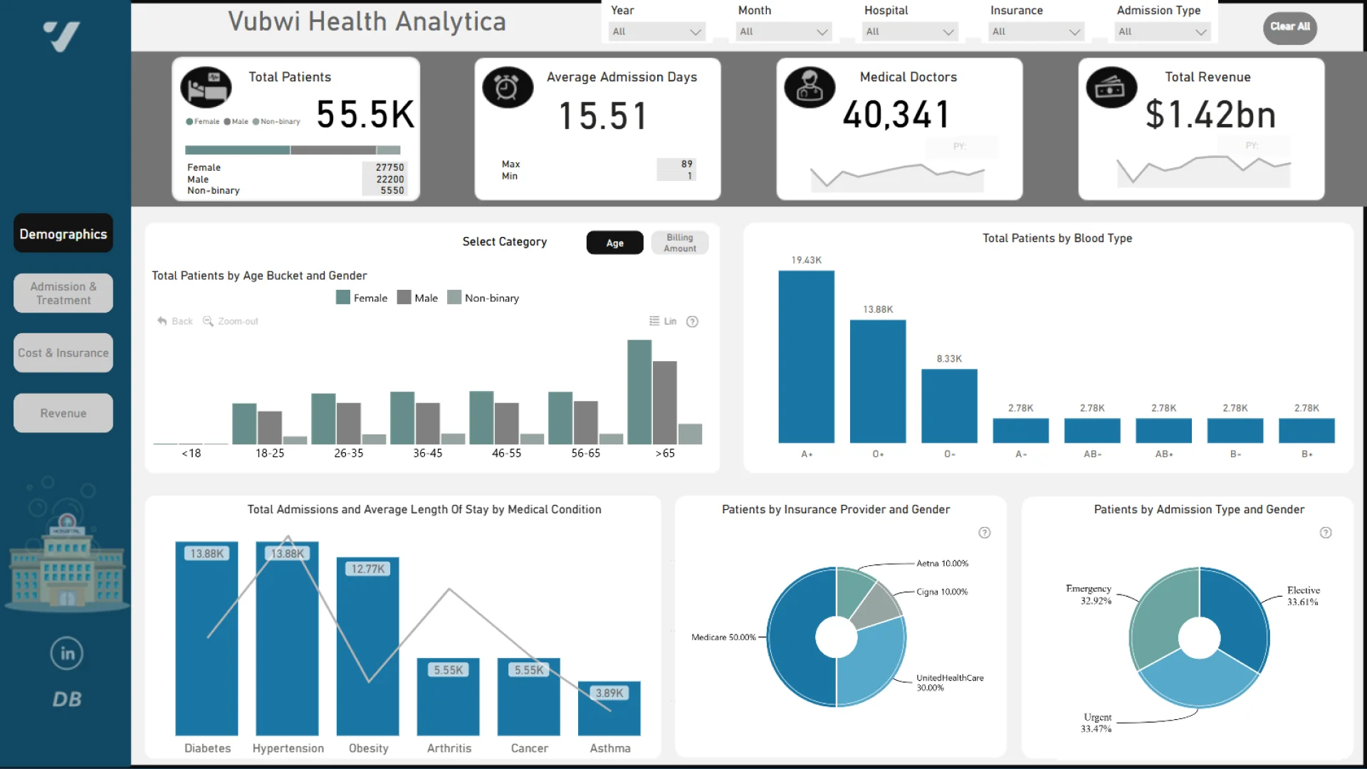 Report submitted for Onyx Data DataDNA ZoomCharts Mini Challenge, April 2025. The report is based on the Healthcare Dataset and includes ZoomCharts custom Drill Down PRO visuals for Power BI.