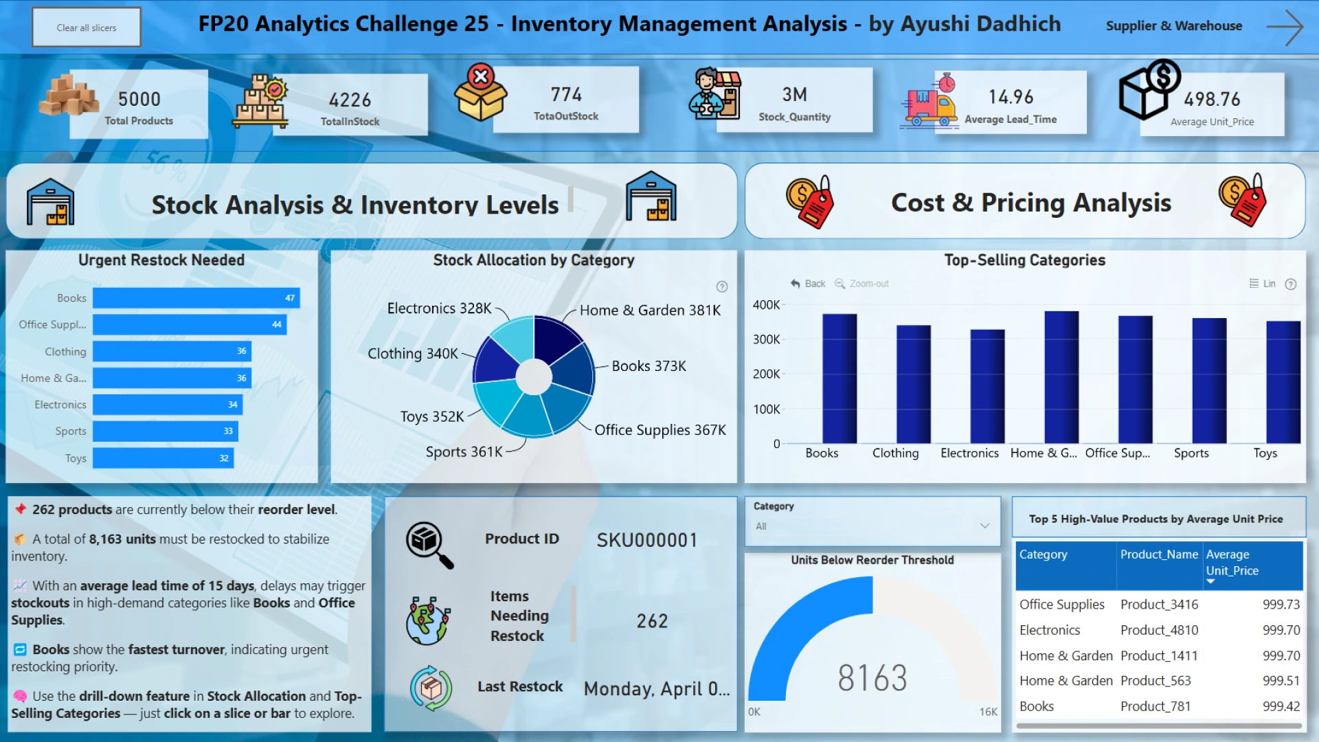 Designed an interactive, insights-driven Power BI dashboard to analyze stock levels, restocking efficiency, supplier performance, and warehouse distribution across 10 countries. Leveraged ZoomCharts visuals for dynamic drill-downs and intuitive data exploration. Key insights include reorder prioritization, average lead times, and category-level stock imbalances, enabling smarter supply chain decisions. Features: Real-time visibility into 5000+ products & 50 suppliers Strategic restocking alerts with reorder threshold tracking Geographic & monthly stock distribution mapping ZoomCharts-powered category & supplier deep dives Clean, consistent UI with guided tooltips and KPIs Outcome: Identified 262 critical products for restock and optimized supplier selection by lead time performance—empowering data-backed operational decisions.