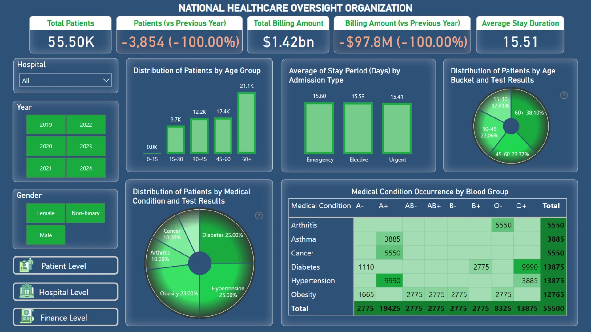 Report submitted for Onyx Data DataDNA ZoomCharts Mini Challenge, April 2025. The report is based on the Healthcare Dataset and includes ZoomCharts custom Drill Down PRO visuals for Power BI.