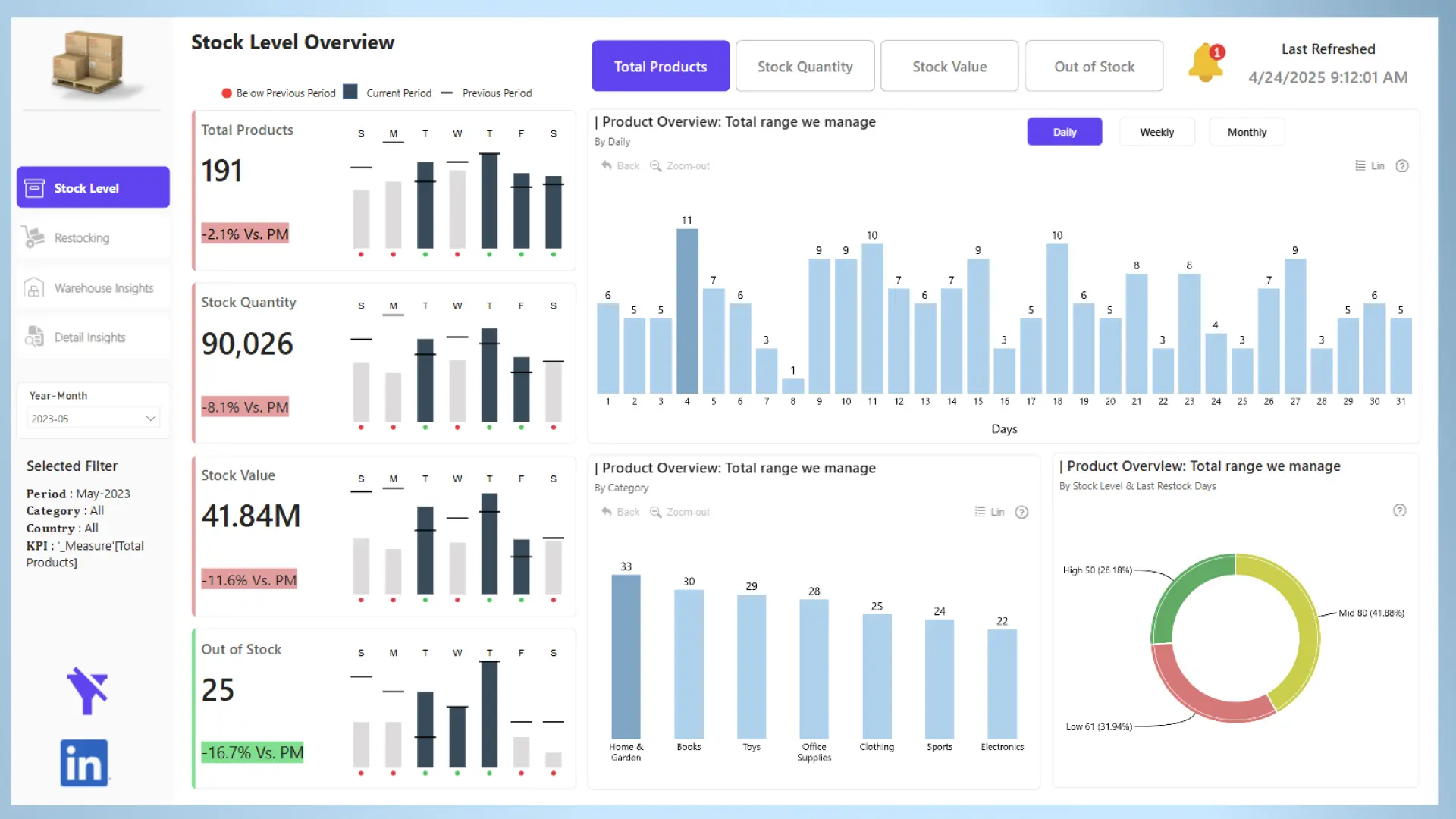 Report submitted for the FP20 Analytics ZoomCharts Challenge, April 2025. The report was built using the Inventory Management Dataset and includes ZoomCharts custom Drill Down PRO visuals for Power BI.
